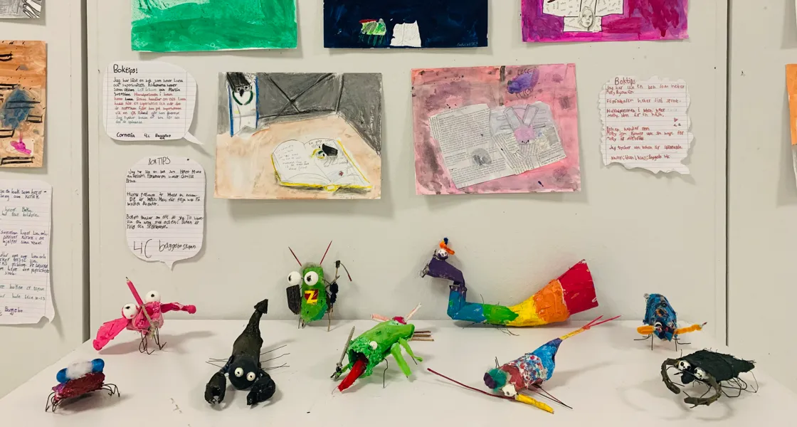 Baggeboskolans åk.4 ställer ut sina bok-baggar. Härliga skapelser och som är bra vid läsning! Bok-baggarna ger även sina bästa boktips!