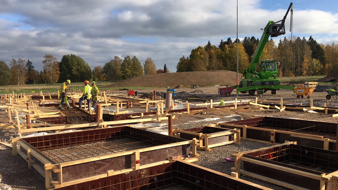 Anläggandet av bottenplattan påbörjades i månadsskiftet september-oktober 2018. Personalen inledde arbetet med att gjuta förstärkningar i form av grundsulor, d v s kanter i betong, och plintar, som ska fånga upp lasten från de pelare som kommer att finnas i huset.