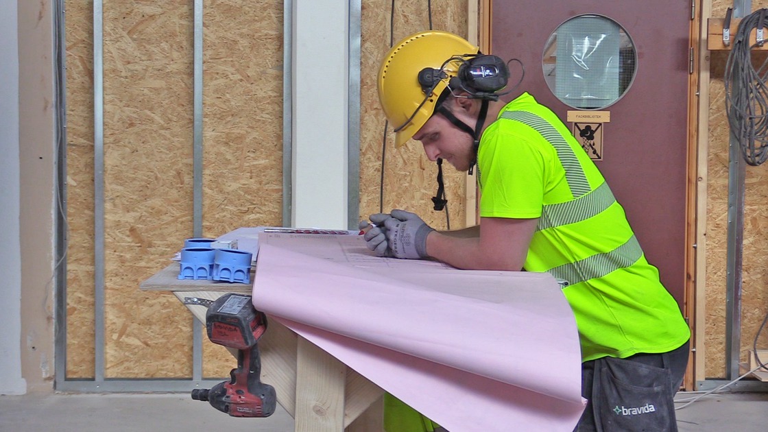 Vägguppsättning, golvarbete och el- och VVS-installation slutfört i entréplanet