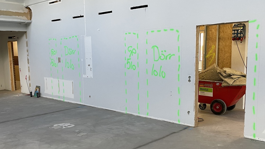 Rivningen av innerväggar och befintliga installationer på plan 2 startade i slutet av mars 2022 och var klar i början av juni. Nya väggar började sättas upp i NO-delen i slutet av april och i början av juni var alla väggar på plats där. Arbetet med innerväggarna på hela plan två var färdigt i början av juli.