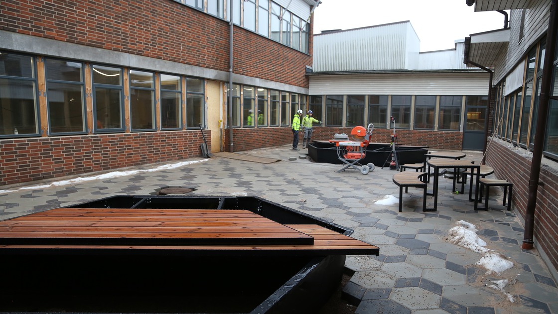 Under vinterhalvåret utfördes en del arbete på skolans innergårdar. Träd och annan vegetation togs bort, plattor monterades, det skapades rabattytor och utemöbler för personalen ställdes på plats.