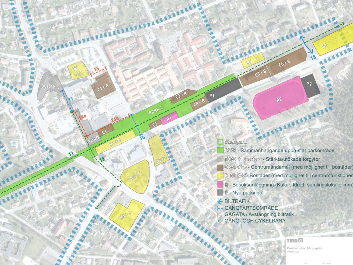 Centrumutvecklingsplanen är ett styrdokument med en ett antal insatsområden och åtgärdsförslag som ger en tydlig vägledning för hur centrala Tibro ska utvecklas på ett hållbart sätt utifrån kommunens vision. Planen har kompletterats med en genomförandeplan och de åtgärder som beslutas om projekteras på detaljnivå enligt principer om samverkan och medskapande där näringsliv och civilsamhället kan bli delaktiga för att tillsammans med kommunen kunna skapa offentliga miljöer boende och besökare kan må bra och trivas i.