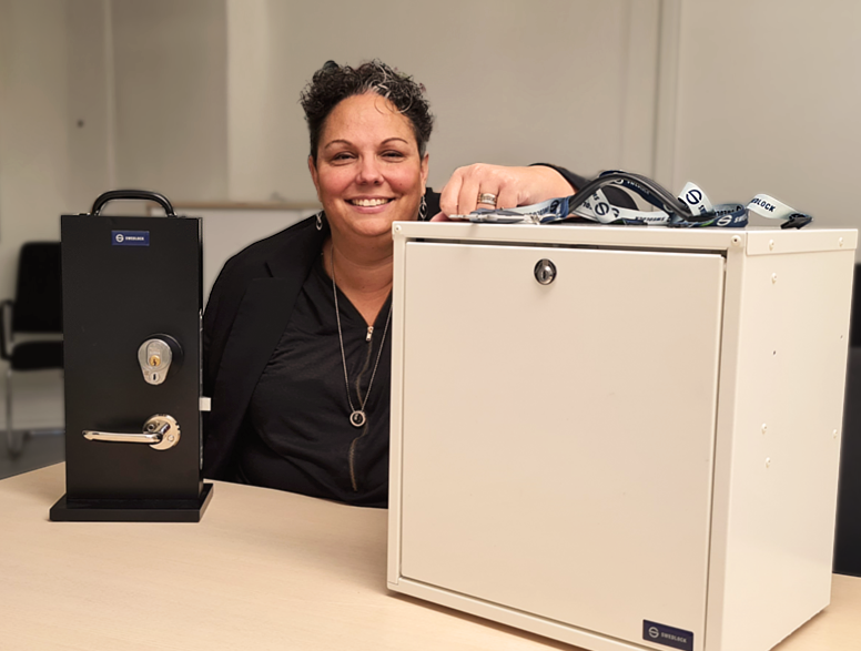 Kommunens projektledare för införandet av nyckelfri hemtjänst är Linda Batshon Nilsson, som är IT-samordnare på socialförvaltningen. På bilden nedan ser vi Linda tillsammans med en demo på de nya dörrlåsen till höger, och ett nytt läkemedelsskåp till vänster.