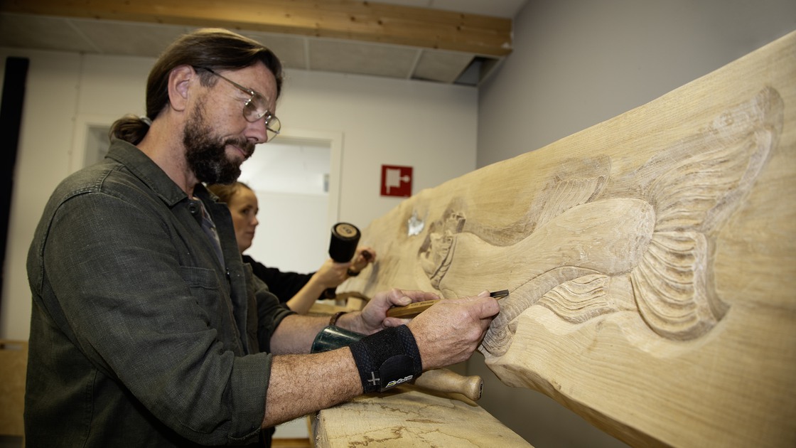 Det är andraårseleverna på yrkeshögskoleutbildningen till träbildhuggare på Tibro Hantverksakademi som i ett samarbete med Tibro kommun har skapat bänkarna som alla har varsitt tema: