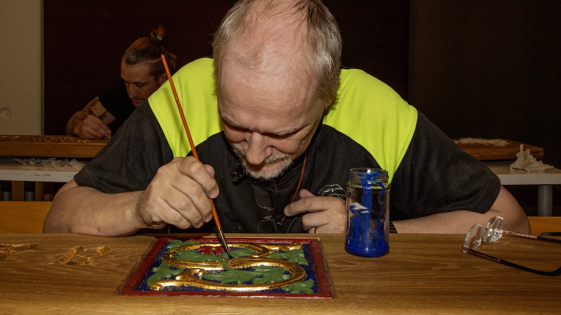 Bänkarnas ryggstöd utgörs av sniderier på de olika temana. Dessa är sedan behandlade med rå linolja och förgyllda.
